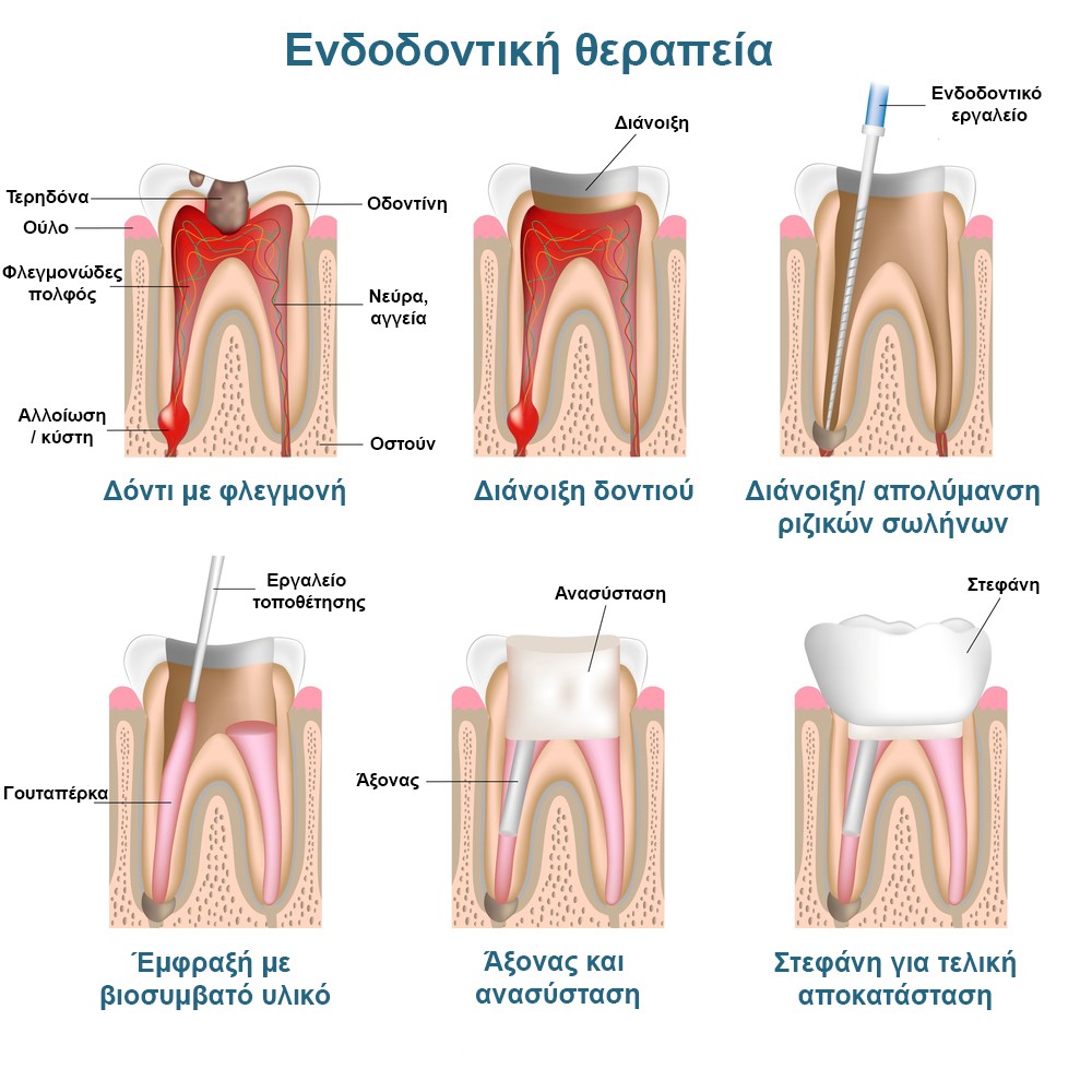 Before starting the procedure, an x-ray check is required to determine the morphology of the tooth roots and to see if there are traces of infection of the surrounding bone. Endodontic treatment is naturally performed with local anesthesia and is painless. First we create access to the inside of the tooth, remove the pulp and disinfect the root canals. When the root canals have been completely cleaned, we plug them with a special elastic material (gutta-percha). At the end of the procedure, we seal the tooth permanently and depending on the extent of the damage, we may use a crown or even a shaft to strengthen and protect it.